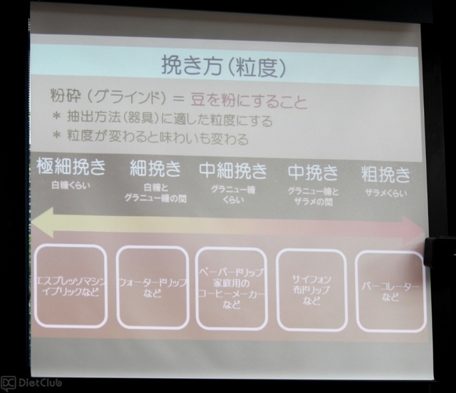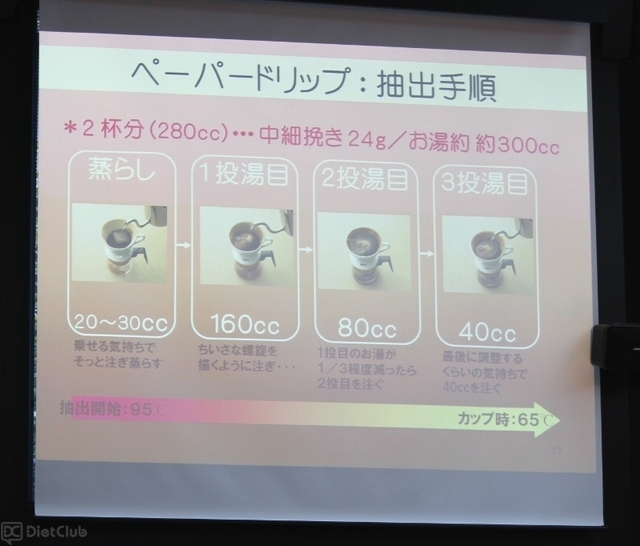 森氏は、イベント会場のレストランに集まった参加者たちを前に、「おいしいコーヒーの基本原則」や「挽き方(粒度)」、「ペーパードリップの方法(蒸らし・抽出手順)」などを丁寧に説明したり、二通りの淹れ方を紹介。参加者たちは、各テーブルに用意されたセット(ブルーマウンテンコーヒーの豆、コーヒーミル、コーヒー専用ポット、サーバー、ドリッパー、ペーパーなど)を使用してハンドドリップに挑戦した。