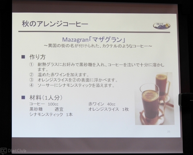 田崎氏は、今回のイベントで「コーヒーテイスティング」や、コーヒーに赤ワインをブレンドしたアレンジコーヒー「マザグラン」の作り方を紹介。イベント参加者たちは、ブルーマウンテンを使った新作限定スイーツとともに、田崎氏のアレンジコーヒーを味わっていた。