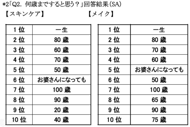 一方メイクは、1位「一生」(1,183人)、2位「80歳」(82人)、3位「70歳」(78人)という結果になっている。「一生」と答えた人が圧倒的に多く、美容に対する意識の高さが感じられる一方、「40歳」や「50歳」という回答もあった。