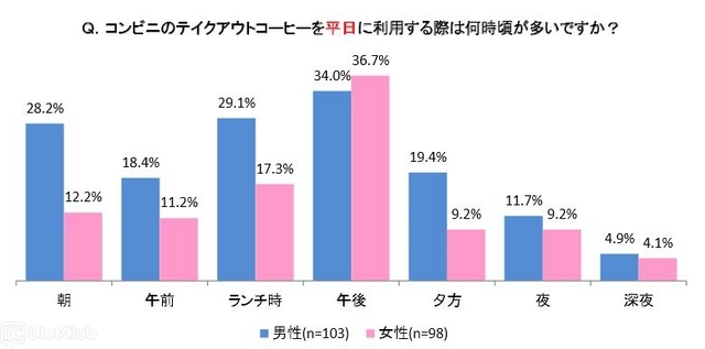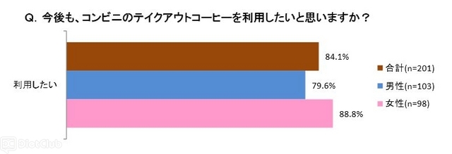 このほか、『今後も、コンビニのテイクアウトコーヒーを利用したいと思いますか?』という問いでは、84.1%が「利用したい」と回答。なお、性別での内訳は男性が79.6%、女性は88.8%だった。