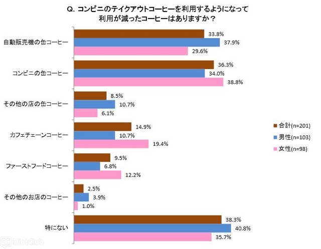 また、コンビニでテイクアウトコーヒーを購入したことがある人に対し、『コンビニのテイクアウトコーヒーを利用するようになって、利用が減ったコーヒーはありますか?』という質問を行ったところ、以下のような結果になった。
