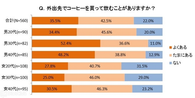 まず始めに、『外出先でコーヒーを買って飲むことがありますか?』と質問したところ、35.5%の人が「よくある」と回答。「たまにある」と答えた人は42.5%で、「ない」と回答した人は22.0%だった。年齢別でみると、30代男性で「よくある」と答えた人が52.4%おり、もっとも多かった。