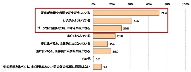 続いて、『冬、あなたの足の状態はどうなっていますか』と聞くと、「足裏が乾燥や角質でガサガサしている」(71.4%)、「ヒザがかさついている」(41.6%)、「ブーツなどを脱いだ時、ニオイが気になる」(30.5%)などの回答が得られた。
