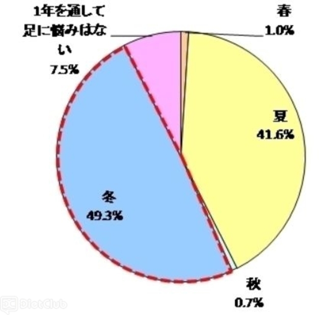 まず、『足の悩みがもっとも気になる季節』を尋ねたところ、49.3%の人が「冬」と回答してトップに。次いで「夏」(41.6%)、「春」(1.0%)、「秋」(0.7%)という結果になった。