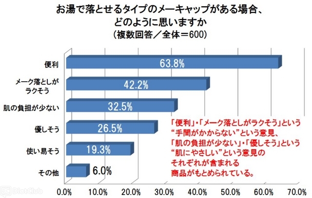 続いて、『お湯で落とせるタイプのメーキャップがある場合、どのように思いますか』と聞いたところ、「便利」(63.8%)、「メーク落としがラクそう」(42.2%)、「肌の負担が少ない」(32.5%) などの回答が得られた。