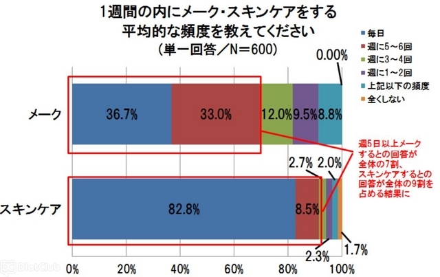 同調査で、『1週間のうち、メーク・スキンケアをする平均的な頻度を教えてください』と質問したところ、メークに関して「毎日」と回答した人は36.7%となり、スキンケアを「毎日」していると答えた人は82.8%だった。