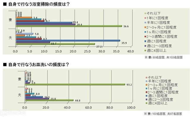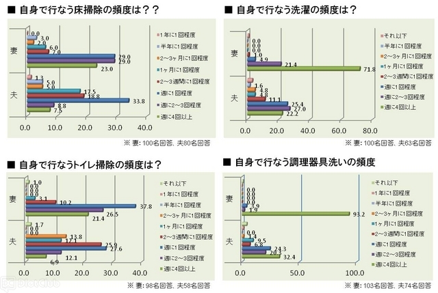 アンケートでは、家事を手伝う夫“家事メン”の家事参加について、夫・妻の立場から、「床掃除」、「浴室掃除」、「トイレ掃除」、「洗濯」、「お皿洗い」、「調理器具洗い」といった家事について、頻度や満足度などについて調査している。