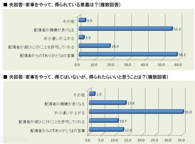 また、夫が家事をやる意義は「妻からのありがとうの言葉」(58.3%)と、「妻の機嫌が良くなること」(55.3%)が多かった。「お小遣いのアップ」が行われる家庭は全体の3%に満たず、家事ぐらいでは財布の口は緩まないのが現実のようだ。しかし、その一方で、家事をやって得られてはいないが、得られたらいいと思う事として、35%の夫が小遣いアップを挙げている。