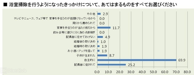 夫がもっとも行う掃除は、「浴室掃除」で、74.8%の夫が週に1回以上やると答えている。 浴室掃除を自主的に行うようになったという夫は70%で、妻に促されては、25%だった。次いで多かったのが、「お皿洗い」である。