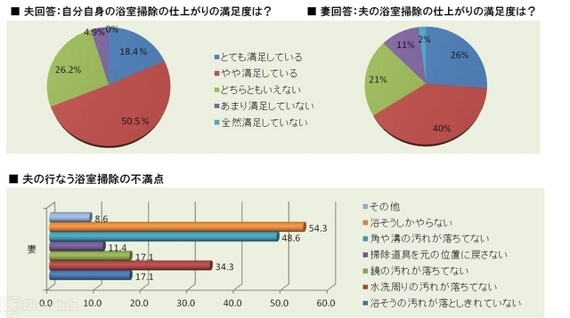 しかし、夫の行う浴室掃除について、妻が指摘する不満点の大多数は、「夫が浴槽しか掃除しない事」で、その他の細かい汚れが落ちていない事を指摘しており、その仕事ぶりには不満もあるようだ。