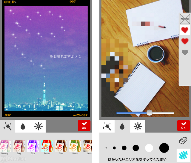 そのほか、フィルターを選ぶだけで、オシャレな写真に早変わりするフィルター機能や、「あると便利」な基本機能として、自宅の写真やオフィス内の写真など、ぼかしツールで特定箇所をさりげなく隠すことが可能である。