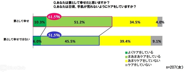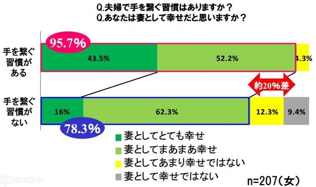 調査の結果、手を繋ぐ習慣がある夫婦の約96%が、自分たちをいい夫婦と感じていることがわかった。また、夫と手を繋ぐ習慣のある妻は、妻として「幸せだ」と感じているという。さらに、幸せだと感じている妻の方が、手肌ケアを日常的に行っていることが明らかになった。