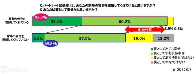 このほか、妻の幸福度と夫の家事への理解の関係性を調べたところ、夫が家事の苦労を理解してくれると答えた約95%の妻は幸せだと感じていることがわかり、理解してくれないと答えた妻と比べると、幸福度に約30%の差があることが明らかになった。