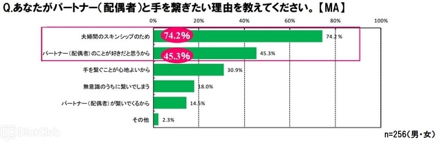 また、「夫婦で手を繋ぐ習慣がありますか?」という質問に対して、約33%が手を繋ぐ習慣があると回答。「手を繋ぎたいと思いますか?」という質問に対しては、約61%が手を繋ぎたいと回答している。
