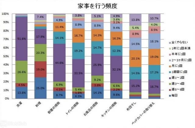 次に、いつも家事をどれくらいの頻度で行っているのか、家事を「洗濯」、「料理」、「部屋の掃除」、「トイレの掃除」、「お風呂の掃除」、「キッチンの掃除」、「布団干し」、「ベッドカバーの取り替え」の8種類に分け、それぞれの頻度を調査した。