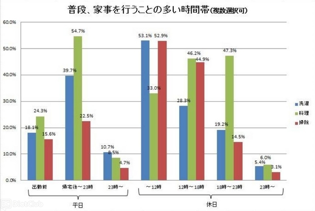 まず、全体の23.7%は「平日:出勤前」、「平日:帰宅後~23時」、「平日:23時~」を1つも選択しなかった。つまり、いつも平日は家事をせず、休日にまとめて行っているようである。