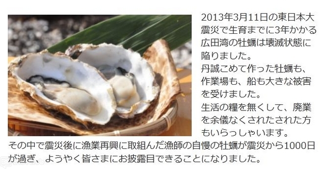 2011年3月11日の東日本大震災では生育までに3年かかる広田湾の牡蠣は壊滅状態に陥り、牡蠣、作業場、そして漁船も大きな被害を受けた。生活の糧をなくして廃業を余儀なくされた漁師もいる。震災から1,000日が過ぎ、震災後に漁業再興に取り組んだ漁師がようやく自信を持って出せる広田湾の牡蠣が今回お披露目となる。