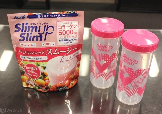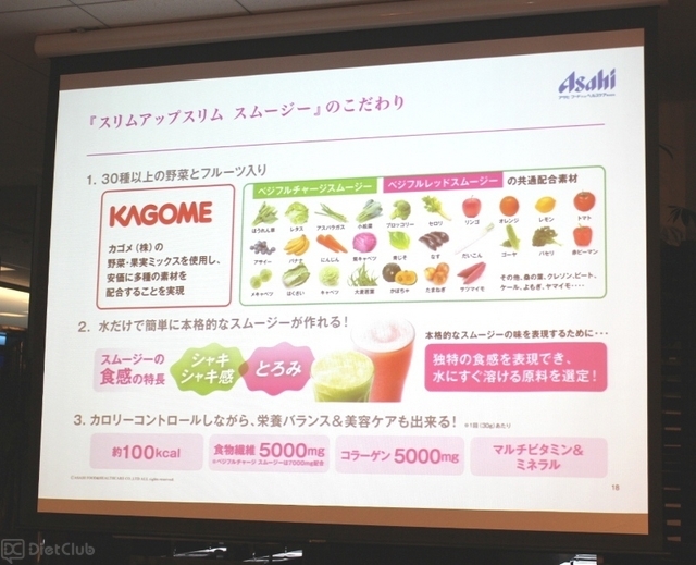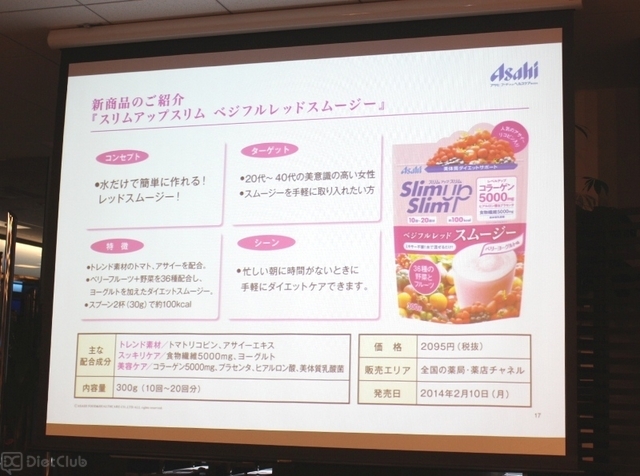 発表会で紹介されたのは、同社が販売しているダイエットサポート食品「スリムアップスリム」ブランドに加わる、粉末タイプのスムージー商品『ベジフルレッドスムージ』など。