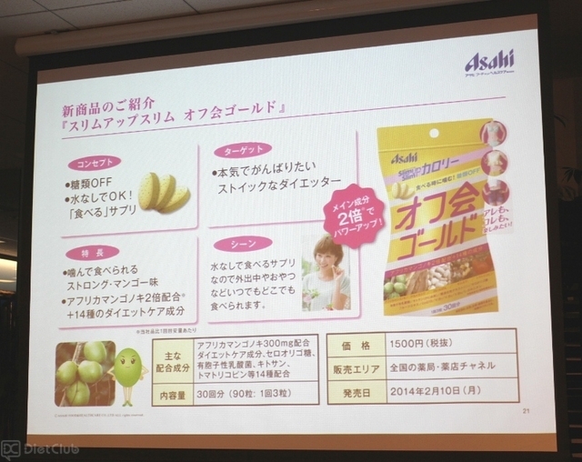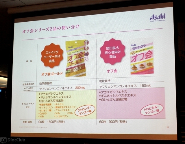 アサヒフードアンドヘルスケア株式会社は、昨年9月に、アフリカマンゴノキを配合したサプリメント『スリムアップスリム オフ会』を発売しているのだが、新商品の『オフ会ゴールド』は、アフリカマンゴノキの配合量を2倍に増やしたという。