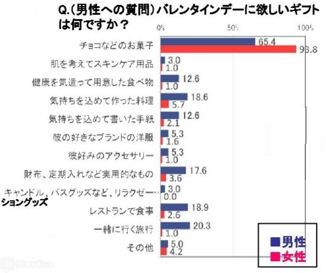 そこで、男性には欲しいギフトを、女性にはあげたいギフトを質問してみたところ、男女ともに「チョコなどのお菓子」が1位。しかし、割合としては女性が93.8%に対し、男性は65.4%しか「チョコなどのお菓子」を欲しいという人がいないという結果で回答に男女でギャップがあった。