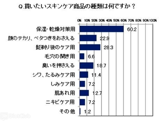また、スキンケア商品を「貰ったら嬉しい」、「まあまあ嬉しい」と回答した人に、「貰いたいスキンケア商品の種類は何ですか?」と質問したところ、6割が「保湿・乾燥対策用(60.2%)」と回答。第2位は「髭剃り後のケア用(28.3%)」、第3位は「顔のテカリ、ベタつきをおさえる(22.9%)」と男性特有の悩みに適応したスキンケア商品。また第4位は「臭いをおさえる(18.7%)」スキンケアが欲しいという結果になった。