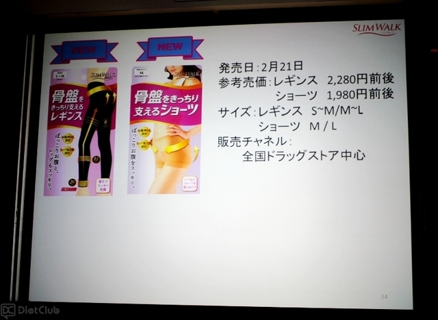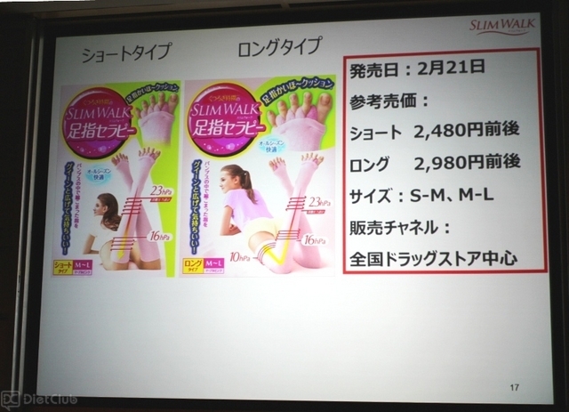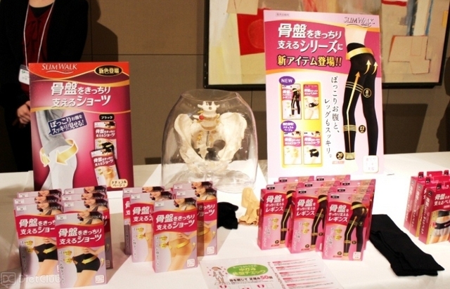 中村氏のセミナー終了後、ピップのスタッフが同社の着圧ソックス「スリムウォーク」の新商品を紹介。足指の間にクッションがある着圧ソックス『くつろぎ時間 スリムウォーク 足指セラピー オールシーズン』と、骨盤を支えるアイテム『骨盤をきっちり支えるレギンス』、『骨盤をきっちり支えるショーツ』を2月21日から全国のドラッグストアで販売を行うことが発表された。