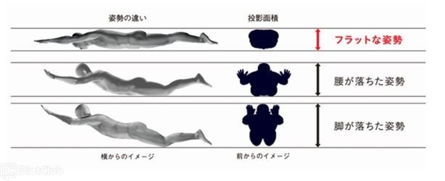 従来の水着と比べ、浮力を約5倍に高めた浮力素材を、スパッツの下腹部と大腿前面部に使用することで、腰を高い位置に保てるようにした。これにより、水面に対してフラットな姿勢をとりやすくなり、心地よく、楽に泳げる水着に仕上げたという。