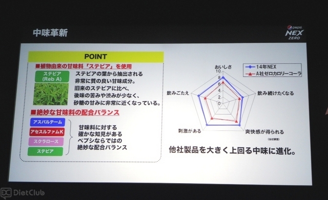 なお、今回リニューアル発売された「ペプシネック ゼロ」は、植物由来の甘味料「ステビア」を新たに使用。従来の甘味料との絶妙な配合バランスにこだわり、コーラ飲料ならではの厚みのある味わいと、後味の自然なキレを実現したという。