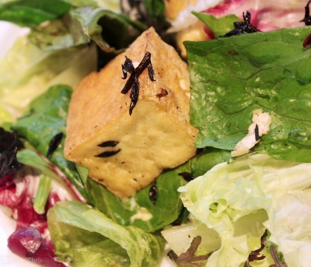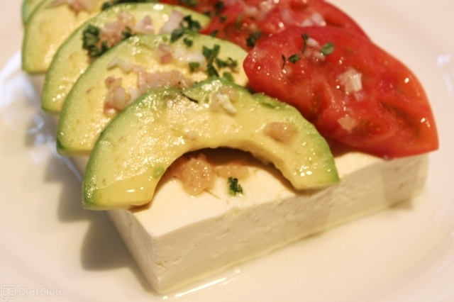 「菊乃井木綿とうふ アボカドとトマト オニオンドレッシング仕立て」を食べているところ