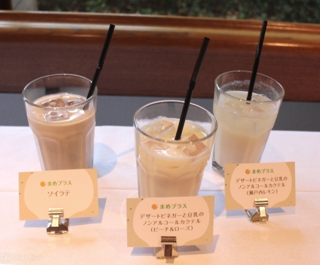 左から、ソイラテ(600円)、デザートビネガーと豆乳のノンアルコールカクテル2品(各500円)
