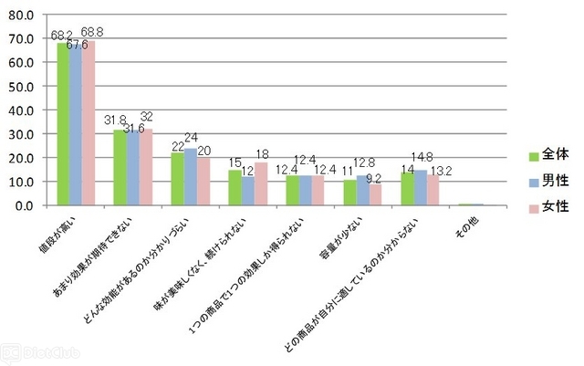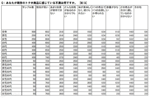 また、『あなたが既存のトクホ商品に感じている不満は何ですか』と聞いたところ、「値段が高い」(68.2%)と答えた人が最も多く、約7割に上っている。その他の不満は「あまり効果が期待できない」(31.8%)、「どんな効能があるかわかりづらい」(22%)、「味が美味しくなく、続けにくい」(15%)と続いている。世代での違いは20代・30代女性では「味が美味しくなく、続けにくい」と回答した人が2番目に回答が多くなっており、若い女性ほど効果よりも、美味しく長く続けられる事を重視する傾向にあるようだ。