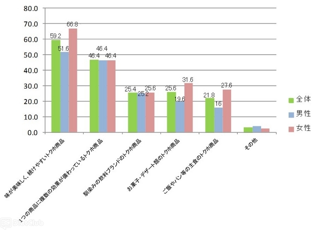 そこで、『次のうち、あなたが欲しいと思うトクホ商品はどれですか』と聞いたところ、1位は「味が美味しく、続けやすいトクホ商品」(59.2%)、2位は「1つの商品に複数の効果が備わっているトクホ商品」(46.4%)という結果となった。この2つの回答を比較すると、女性の多くは味に意識が向いており、30代女性になると30%の開きがある。しかし、男性の30代~50代はおよそ2%差とかなり僅差に迫っており、60代男性になると「1つの商品に複数の効果が備わっているトクホ商品」が上回る結果となっている。