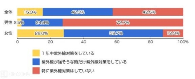 しかしながら、同調査対象者たちに、『あなたは紫外線対策をしていますか?』と聞くと、「特に紫外線対策はしていない」という人が全体で42.5%おり、男性においては、72.2%の人たちが紫外線対策を行っていないことがわかった。