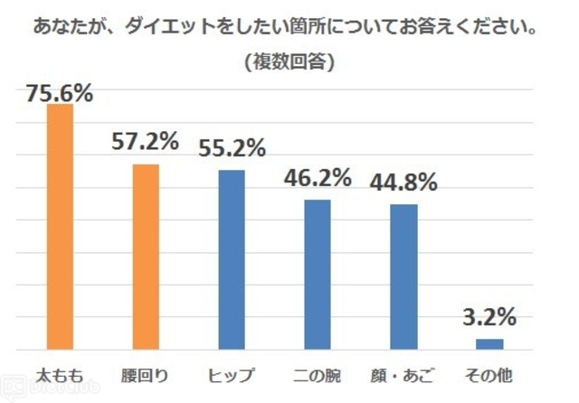 次に「ダイエットしたい箇所は?」という設問では、全体・世代別ともに「太もも」が多い結果となった(全体:75.6%、10代:76.3%、20代:76.7%、30代:73.3%)。一方で、世代間で大きな違いがみられたのは、「腰回り」という回答で、年齢が上がるにつれて、「腰回り」をダイエットしたいという回答が高くなり、10代では38.8%であったのに対し、30代では66.7%となり、10代の実に1.7倍という結果になった。