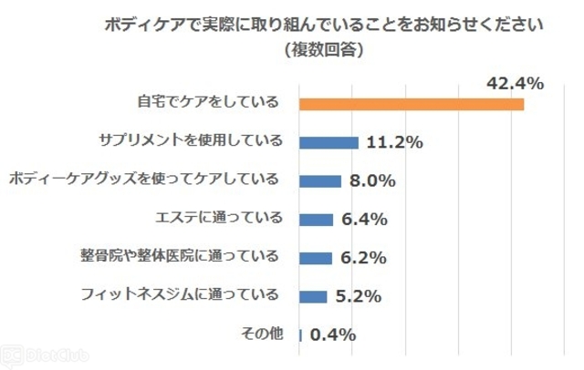 「ボディケアで実際に取り組んでいることは何ですか?」と尋ねたところ、「自宅でケアをしている」という回答が全体・世代間で1位になっている(全体:42.4%、10代:35.0%、20代:41.9%、30代:47.3%)。その他の回答では大きな差はなく、「エステに通っている」6.4%、「整骨院や整体医院に通っている」6.2%、「ボディケアグッズを使ってケアしている」8%、「フィットネスクラブ・ジムに通っている」5.2%、「サプリメントを使用している」11.2%となり、「自宅でのケア」を取り入れている女性が圧倒的に多いことが明らかになった。