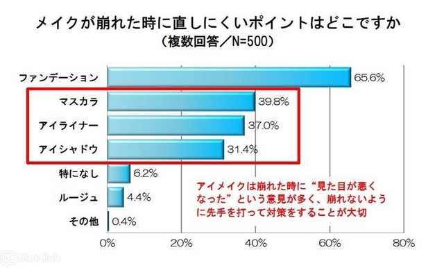 「メイクが崩れた時に直しにくいポイントはどこですか」について尋ねたところ、1位は「ファンデーション」で65.6%、次いで「マスカラ」が39.8%という結果になった。