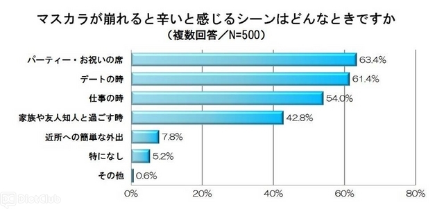 「マスカラが崩れると辛いと感じるシーンはどんなときですか」と尋ねたところ、6割以上が「パーティー・お祝いの席」「デートの時」といった、特に女性がおしゃれに気を使うシーンを挙げた。また、「マスカラがにじむと思う原因はなんですか」という質問に対して、割合が高い順に「汗(74.6%)」「皮脂(50.4%)」「水・お湯(27.0%)」との結果も出ている。