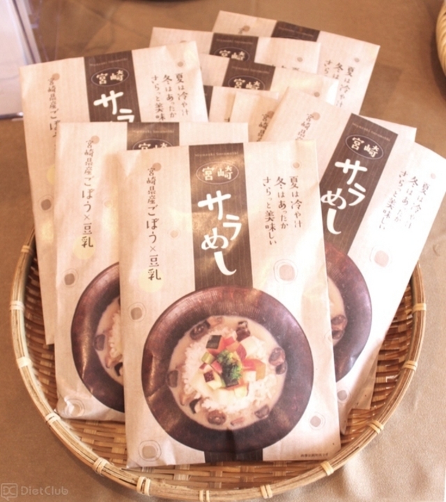 4品の中で特に気になったのは「宮崎サラめし」。同商品は宮崎県の郷土料理として知られている「冷汁」をヒントにしたスープ状のレトルト食品で、宮崎県産のごぼうや国産の乾燥しいたけ、無調整の豆乳などを原料に使用している。食物繊維やビタミンB群・Eなどを手軽に摂れるところがポイントで、100g当たりのカロリーは29kcalとのこと。