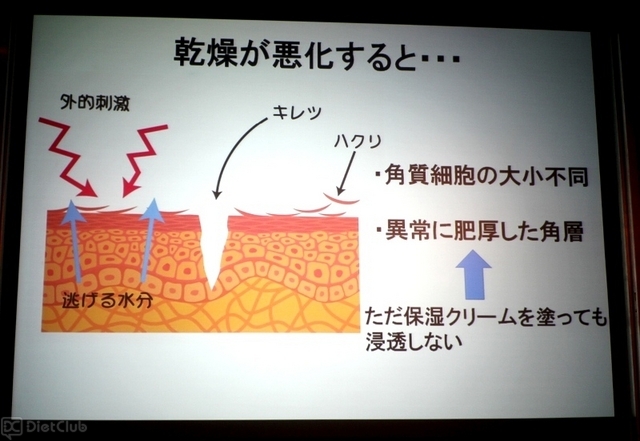 講演の中で吉木氏が問題視していたのは、肌の乾燥が慢性化することでターンオーバー(肌の新陳代謝・生まれ変わり)が早まる「錯角化」。吉木氏によれば、肌の乾燥が悪化して錯角化すると、肌のバリア機能が低下して、肌のカサつきやひび割れ、亀裂などが発生しやすくなり、保湿クリームを塗っても浸透しない肌になってしまうらしい。