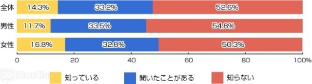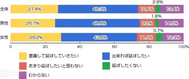 「健康寿命」という言葉を知っているか尋ねたところ、「知っている」と答えたのは14%で、女性の方が認知している人が多かった。健康寿命について尋ねたところ、74%が「意識して延ばしたい」「出来れば延ばしたい」と回答し、健康寿命を延ばしたい人が7割を超えた。