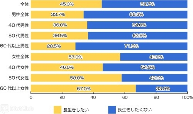 配偶者より長生きしたいか尋ねたところ、「長生きしたい」と答えたのは45%だった。男性は34%が、女性は57%が「長生きしたい」と回答しており、女性の方が配偶者より長生きしたいと思っている人が多いようだ。