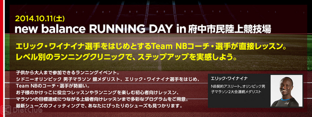 10月11日に府中市民陸上競技場で行われる『オリンピック銀メダリストエリック・ワイワイナ選手をはじめとするNBコーチ、選手が直接レッスン New Balance RUNNING DAY』は、マラソン初心者からSUB3ランナー向けスピードトレーニングまでレベルに合わせたランニングクリニック、かけっこキングのエリック・ワイナイナ氏によるかけっこレッスン、効率的なランニングフォームのための体作りを目的とした体幹トレーニングレッスン、NB専属スタッフによるフィッティングの後、各々のレベルにあったシューズを履いて自由に競技場をランニングできる試走や、身体能力検定などを開催予定である。応募は9月8日から「NB FIT PARKモバイル」で開始し、応募締め切りは9月29日。定員は後日発表される。