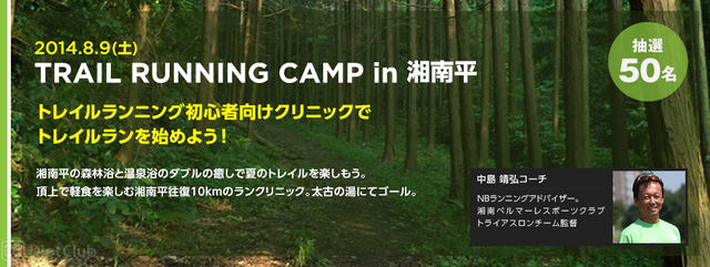8月9日に湘南平で行われる『夏は森林浴を楽しみながら走ろう! TRAIL RUNNIING CAMP』は、NBランニングアドバイザー中島靖弘氏による座学と頂上で軽食を楽しむ、湘南平往復10kmのランクリニック。現在応募を「NB FIT PARKモバイル」で受け付けており、抽選で50人が参加できる。応募締め切りは7月29日。