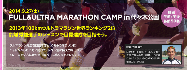 9月27日に代々木公園で行われる『ウルトラマラソン世界2位の能城選手のレッスン FULL&ULTRA MARATHON CAMP』は、午前の部ではフルマラソン完走に向けた走り方やシューズの選び方などの座学とレッスン、午後の部では、ウルトラマラソンにチャレンジしたい人向けの座学とレッスン、午前・午後共通でNB専属スタッフによるフィッティングと最新シューズの試履きが行える。応募は8月25日から「NB FIT PARKモバイル」で開始し、抽選で午前・午後各50人が参加できる。応募締め切りは9月16日。