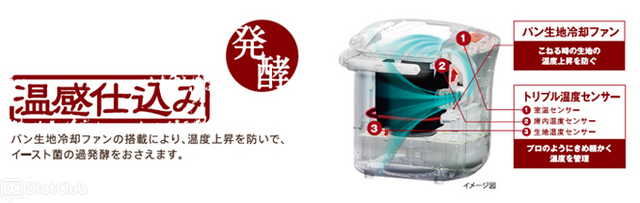 同社が炊飯ジャーで培った「土鍋コーティング」の技術をホームベーカリーへ展開し、遠赤外線と高火力で焼き上げる「土鍋焼き」。更に、室温と庫内温度を測りながらパンケースの温度をきめ細かくコントロールするトリプルセンサーを搭載。そして冷却ファンで、パン生地の温度上昇を防ぎ、イースト菌の過発酵を押える「温感仕込み」を搭載。これらの効果で、外側はパリッと薄皮、中はふっくらの「パリふわ食感」を実現しているという。