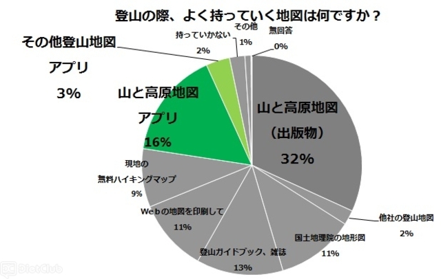 「登山の際、よく持っていく地図は何ですか?」という質問では、約30%以上が「山と高原地図」を持っていくと回答した一方、約20%が同社の「山と高原地図アプリ」やその他の登山地図アプリを利用していることがわかった。「山と高原地図アプリ」は、GPSによる現在地確認や山行ログの取得、SNSでの共有が可能な、登山をより楽しむための登山用スマートフォンアプリである。