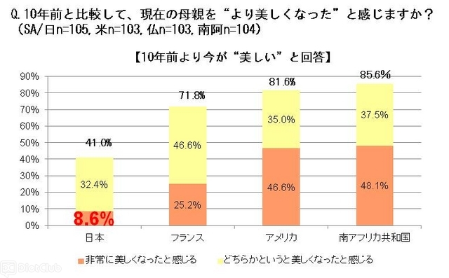 10年前と比較して、現在の母親の美しさを聞いたところ、日本以外の3か国は、70%以上が、歳を重ねた“現在の母親”の方が“美しい”と回答したのに対し、日本は半数未満の41.0%という結果になった。また、「非常に美しくなった」と回答した人は、最も多い南アフリカ共和国48.1%に対し、日本は8.6%と一割に満たなかった。
