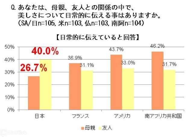 “美しさ”を本人に直接伝える機会について聞いたところ、日本人の40.0%が、友人に対して美しさを日常的に伝えている一方で、母親に対して伝えている女性は26.7%という結果になった。他3か国は、身近な家族である母親に、美しさを伝える機会が友人よりも多いのに対し、日本は身近な人にほど美しさに対する評価を伝えない傾向にある事が明らかになった。