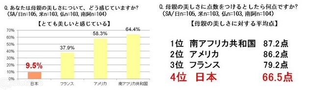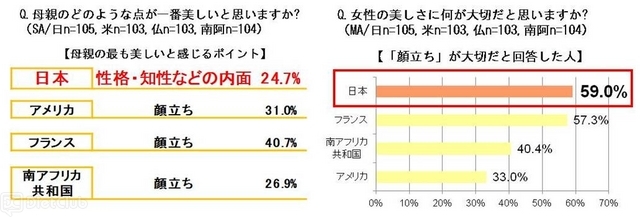 母親の美しさに対するポイントを聞いたところ、他3か国が「顔立ち」という外見的要素を最も高く評価した一方で、日本は内面的要素を最も評価した結果となった。一方で、女性に求める美の基準に関して聞いたところ、「顔立ち」が重要だという回答は日本が最も高く、外見的な基準を高く評価している事がわかった。