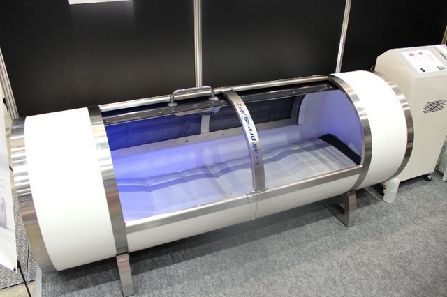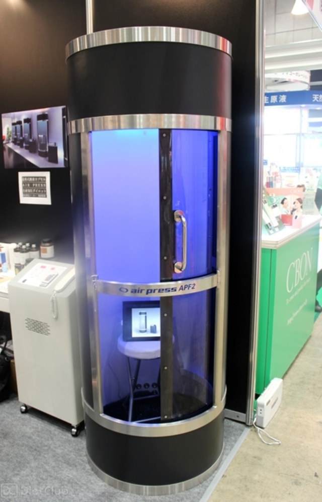 まず、目に入ったのは「酸素カプセル」。会場内で酸素カプセルを紹介していたスタッフによれば、酸素カプセルに入ることで、リンパの流れと血液循環が促進されるらしい。その結果として、疲労が回復したり、肩こりの軽減や、痩せやすい体になっていく可能性があるようだ。